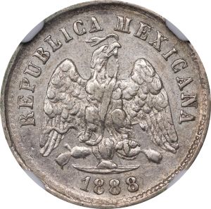 This specimen was lot 71459 in Stack's Bowers Collectors Choice sale (Costa Mesa, CA, October 2025), where it sold for $192. The catalog description[1] noted, "MEXICO. 10 Centavos, 1888-Z_ Z. Zacatecas Mint. NGC AU-55. Error with missing "s" in mintmark. Only example in NGC Census. Rare error. From the Kirk Menczer Collection of Republican Decimal Minors." This date marks the second in a series of “Z Z” errors, where the “s” was omitted from the mintmark. Similar errors are known for 1886, 1890, 1896 and 1897. The regular date is common, this error is somewhat scarce. The Zacatecas mint was one of four mints that struck the ten centavos with the redesigned eagle, starting in 1898.
