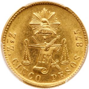 This specimen was lot 3585 in Goldberg sale 104 (Los Angeles, June 2018), where it sold for $1,290. The catalog description[1] noted, "Mexico. 5 Pesos, 1889-ZsZ. Balance scales and Liberty Cap. Reverse: Eagle. Mintage 373. PCGS graded MS-64." Shown is an 1889-Zs Z five pesos gold piece, of a type struck at Zacatecas 1870-1905. The type is also recorded from Culiacan, Durango, Guanajuato, Alamos, Chihuahua and Hermosillo but Mexico City is by far the most prolific issuer. Despite the miniscule mintage, the 1889-ZsZ is not considered a rare date.