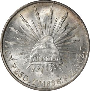 This specimen was lot 7844 in Stack's Bowers NYINC sale (New York, January 2022), where it sold for $384. The catalog description[1] noted, "MEXICO. Peso, 1898-Zs FZ. Zacatecas Mint. PCGS MS-63. A bright and lustrous Peso, with frosty surfaces and pleasing peripheral toning. A struck through object, perhaps a thread, is noted on the left wing of the eagle."