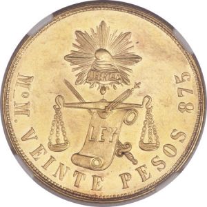 This specimen was lot 31352 in Heritage sale 3035 (Long Beach, September 2014), where it sold for $14,687.50. The catalog description[1] noted, "Republic gold 20 Pesos 1905 Mo-M MS63 NGC, Mexico City mint. Choice Mint State with mostly reflective surfaces and the few scattered handling marks expected at this designation. Among the finest seen of this date and most elusive in this charming quality. From The FoxLair Collection." This type was struck at Mexico City 1870-1905. The type is also recorded from Culiacan, Durango, Guanajuato, Alamos, Chihuahua, Hermosillo, Oaxaca and Zacatecas but Mexico City is by far the most prolific issuer. The 1905MoM is considered a common date. Mintage figures are not a reliable indicator of rarity for this type due to the accidents of hoarding; many low mintage issues are readily available while other high mintage issues are very rare.