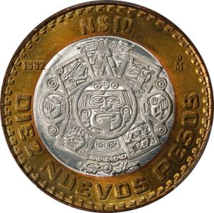This specimen was lot 72908 in Stack's Bowers Collectors Choice sale (Costa Mesa, CA, November 2022), where it sold for $630. The catalog description[1] noted, "MEXICO. 10 Pesos, 1992-Mo. Mexico City Mint. PCGS MS-69. Top Pop example in PCGS, and as choice as one could hope for. Silver center with an Aluminum-Bronze ring." This specimen is one of a type issued 1992-95. In 1997, the type was revised to drop the "N" in "N$10" and the center was converted to copper-nickel from silver.