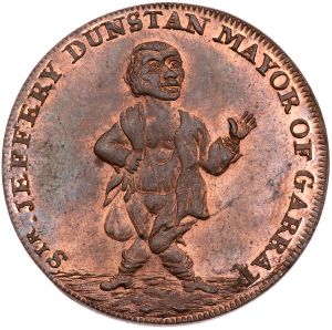 This specimen was lot 2745 in Goldberg sale 91 (Los Angeles, June 2016), where it sold for $235. The catalog description[1] noted, "Great Britain. Halfpenny token, 1795 NGC MS65 RB. George III. Hall's London (Middlesex) Conder copper Penny token. Obverse dwarf standing: JEFFERY DUNSTAN MAYOR OF GARRAT. Reverse, text on 3 lines in centre and round periphery: NEAR FINSBURY SQUARE LONDON 1795, and TO BE HAD AT THE CURIOSITY HOUSE CITY ROAD. Jeffrey Dunstan, a travelling dealer in old wigs was elected Mayor of Garrat, a small village in Surrey. He was superseded by a muffin seller 'Sir' George Cook, and died from alcoholism in 1797. A rare token in this condition. Mint state with original color. NGC graded MS-65 Red & Brown."
