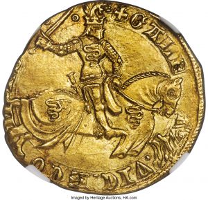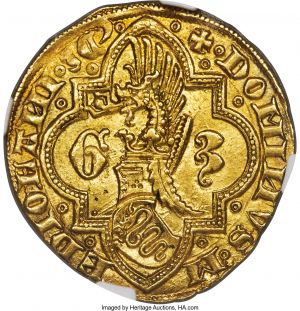This specimen was lot 31872 in Heritage sale 3076 (Long Beach, CA, September 2019), where it sold for $4,560. The catalog description[1] noted, "Italy. Milan. Galeazzo II Visconti gold Florin ND (1354-1378) MS64 NGC. + GALE AZ VICE CO M ES :, Duke on horseback charging right, wielding sword / • + • DOMINVS • M EDIOLANI • 3C', crested dragon helm between G and 3 within tressured frame. A lightly toned and well struck example with residual mint luster still evident in the fields. From the Allen Moretti Swiss Collection." The Visconti ruled Milan 1324-1447 and their badge of a snake swallowing a child is still the emblem of the city.