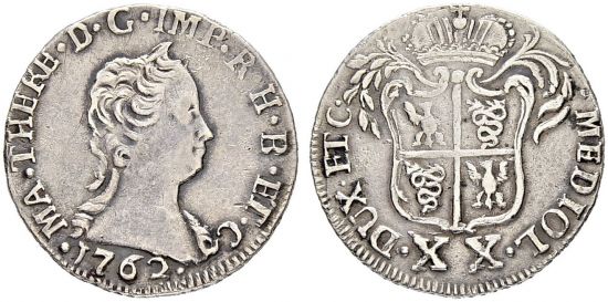 "ITALY | Milan, Maria Teresa d'Asburgo, 1740-1780 20 Soldi 1762. Mailand. Sehr schön. (duchy of Milan, Maria Theresia of Hapsburg, 1740-80, twenty soldi of 1762, Milan mint. Very fine.)"