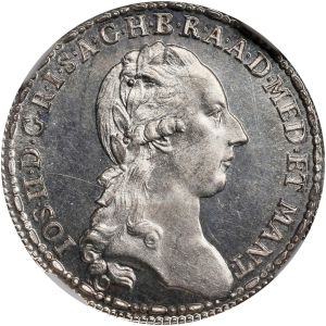 This specimen was lot 32171 in Stack's Bowers NYINC sale (New York, January 2025), where it sold for $2,160. The catalog description[1] noted, "ITALY. Milan. Silver Medallic 1/2 Lira, 1781. Milan Mint. Giuseppi (Joseph) II. NGC MS-64+. A VERY RARE semi-medallic issue featuring an extremely sharp strike and an abundance of frosty brilliance, this example is exceeded in the NGC census by just one other. Includes original collector's ticket of Clelio Varesi." There exists a half lira struck for circulation 1781-87 (KM 206). This is an acclamation issue for Joseph II, who became duke of Milan on the death of his mother Maria Theresia in 1780. This was doen again in 1792 for Francis II.