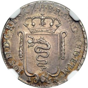 This specimen was lot 4851 in Goldberg sale 74 (Los Angeles, June 2013), where it sold for $357 including buyer's fees. The catalog description[1] noted, "Italian States - Milan. 5 Soldi, 1784. Joseph II. Crowned shield of Milan snake arms. Reverse: Value within wreath, date below. NGC graded MS-62." This denomination, equal to one fourth of a lira, was struck on occasion starting in 1722. This, the final type, was issued 1780-887. The design prominently features the arms of Milan, derived from the arms of the Visconti, featuring a crowned snake swallowing a child.