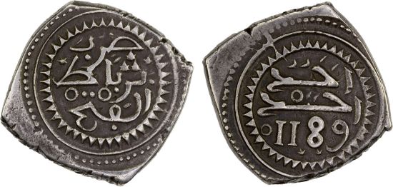 Prior to the coinage reform of 1889, Moroccan coins were either hammered or cast, and counterfeits abounded. What was lacking in local coins was made up for by the circulation of large quantities of foreign silver currency. Shown is a ten dirham silver hammered coin struck AH 1187-1189. This specimen was lot 1590 in Stephen Album sale 50 (Santa Rosa, CA, September 2024), where it sold for $600. The catalog description[1] noted, "MOROCCO ('ALAWI SHARIF): Muhammad III, 1757-1790, AR 10 dirhams (mithqal), AH1189, 1st standard with ahad ahad ("one one", i.e., "God is One") followed by the date on reverse, only the mint name on obverse, squarish flan, VF, ex Dr. Robert A. Rosenfeld Collection." Among other events during Muhammed's long reign, Morocco became the first nation to recognize the United States of America as an independent nation.