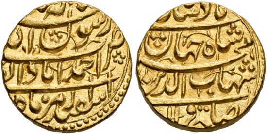 This specimen was lot 2450 in Sincona sale 77 (Zürich, May 2022), where it sold for 13,500 CHF (about US$14,566 including buyer's fees). The catalog description[1] noted, "INDIA | Mughal Empire. Shihab al-Din Muhammad Shah Jahan, 1037-1068 H. (1628-1658). Mohur month Isfandarmuz, Year 1 (1037 H.), Ahmadabad. Sehr selten. NGC MS66. Prachtexemplar. (Very rare, Cabinet piece.)" This type is listed from six mints in India with regnal year 1. Because the character "ahad" is used to mark the first year, it's consdered a separate type. The Mughal Empire dominated India during the seventeenth century but broke up in the eighteenth century under external attack, Hindu rebellion and civil war. This collapse allowed European colonizers entry into the subcontinent and eventual British control.