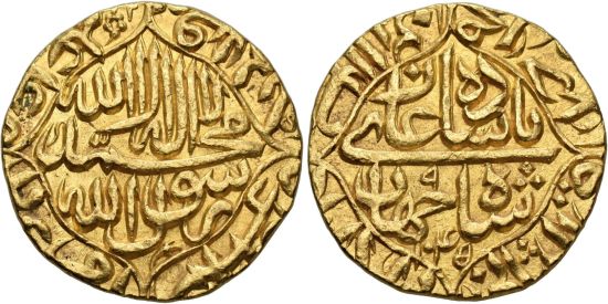 Shah Jahan is most remembered today for having built the Taj Mahal as a mausoleum for his wife. Twenty-five mints struck mohurs for him and Akbarabad is listed in this style for years 6-28. His successors after Aurangzeb (r. 1658-1707) were not able to cope with external attack, Hindu rebellion and civil war and the empire broke up in the eighteenth century.