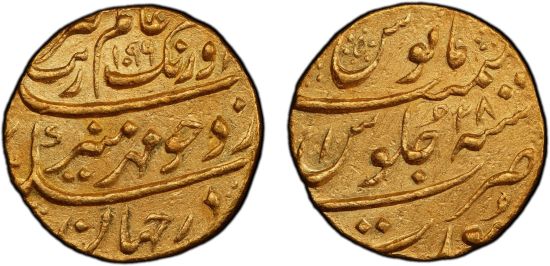 This specimen was lot 898 in Stephen Album sale 45 (Santa Rosa, CA, January 2023), where it sold for $960. The catalog description[1] noted, "MUGHAL: Aurangzeb, 1658-1707, AV mohur, Surat, AH1096 year 28, an attractive nearly mint state example, PCGS graded AU58." Aurangzeb expanded the Mughal empire in all directions and had conquered nearly all of India by the time of his death. Sixty-four mints struck mohurs for him and Surat is listed in this style for years 3-45. His successors were not able to cope with external attack, Hindu rebellion and civil war and the empire broke up in less than a century.