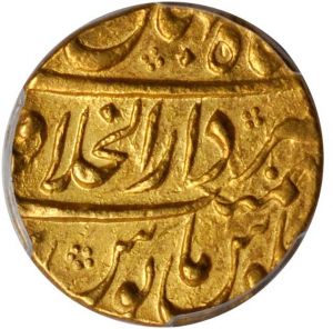 This specimen was lot 40202 in Ponterio sale 168 (Philadelphia, August 2012), where it sold for $1,116. The catalog description[1] noted, "INDIA. Mughal Empire. Mohur, AH (11)22, Year 5 (1710/1). Shahjahanabad Mint. PCGS AU-58 Secure Holder. Shah Alam Bahadur (AH 1119-24 (1707-12))." This type is listed from twenty-three mints in India. The Mughal Empire dominated India during the seventeenth century but broke up in the eighteenth century under external attack, Hindu rebellion and civil war. This collapse allowed European colonizers entry into the subcontinent and eventual British control.