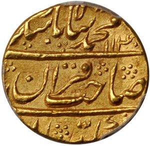 This specimen was lot 40202 in Ponterio sale 168 (Philadelphia, August 2012), where it sold for $881. The catalog description[1] noted, "INDIA. Mughal Empire. Mohur, AH 1140 Year 10 (1727-28). Shahjahanabad Mint. PCGS AU-58 Secure Holder. Muhammad Shah (AH 1131-61 (1719-48))." This type is listed from four mints in India. The Mughal Empire dominated India during the seventeenth century but broke up in the eighteenth century under external attack, Hindu rebellion and civil war. This collapse allowed European colonizers entry into the subcontinent and eventual British control.