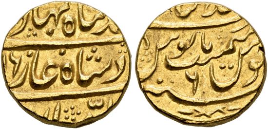 The Mughal Empire stretched over most of India in the early eighteenth century and numerous mints struck gold mohurs for the emperor. The Mughal Empire dominated India during the seventeenth century but broke up in the eighteenth century under external attack, Hindu rebellion and civil war. This collapse allowed European colonizers entry into the subcontinent and eventual British control. This type is listed from fifteen mints in India. It was struck at Shahjahanabad AH 1161-1167.