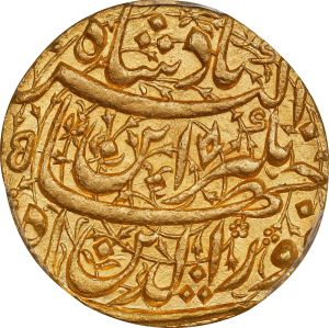 This specimen was lot 54105 in Stack's Bowers NYINC sale (New York, January 2024), where it sold for $46,800. The catalog description[1] noted, "INDIA. Mughal Empire. Heavy Mohur, AH 1018 Year 5 (1609). Agra Mint. Jahangir. PCGS MS-63. A RARE example from the heavier weight second emission--and one that is made all the more so on account of the stunning level of preservation offered here--this enchanting specimen provides an engaging, well centered strike upon each side, tantalizing brilliance emanating from the protected areas, and a highly appealing golden-yellow hue evident throughout. Undoubtedly a tremendous opportunity for the connoisseur and advanced collector within the series." The gold mohur had traditionally weighed about 10.8-10.9 grams; we don't know what impelled Jahangir to issue this type with a weight about 25% over the standard. He may have intended it as a prestige coin; few survive today, suggesting that they were rapidly removed from circulation and melted. It is known dated years 3, 4 and 5.