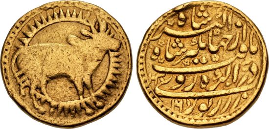 This specimen was lot 1137 in CNG sale Triton XXVII (New York, January 2024), where it sold for $70,437.50. The catalog description[1] noted, "INDIA, Mughal Empire. Nur al-Din Muhammad Jahangir. AH 1014-1037 / AD 1605-1627. AV Mohur. Zodiac Type (month of Ardibihisht), Class A. Agra mint. Dually dated AH 1030 and RY 16 (22 April-21 May AD 1621). Constellation of Tora/Vrishabha (Taurus the Bull): zebu standing right; radiate sun behind / zar zewar dar Agra ruye yaft az Jahangir Shah Akbar Shah (Received ornament on gold at Agra from Jahangir Shah [son of] Akbar Shah) in Persian verse; RY and AH dates to left. Lightly toned, traces of deposits in devices, evidence of having been mounted. VF. Ex Spink USA 355 (19 January 2020), lot 264; Album FPL 160 (April 2000), no. 41." Jahangir scandalized the strict Muslims of his court by issuing this series of mohurs featuring the twelve animals of the zodiac. Always rare, they bring stratospheric prices when they appear at auction. Unusually, this auction also included a Gemini mohur (Fr-764).