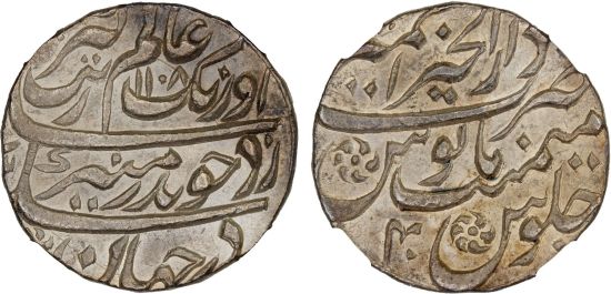 This specimen was lot 2614 in Steve Album Auction 51 (Santa Rosa, CA, January 2025), where it sold for $264. The catalog description[1] noted, "MUGHAL: Aurangzeb, 1658-1707, AR rupee, Shahjahanabad (Delhi), AH1108 year 40, superb bold strike! NGC graded AU58." Aurangzeb succeeded Shah Jahan and, after eliminating his brothers, expanded the empire to its maximum extent. However, his intolerance of Hinduism sowed the seed for later revolts. His successors were not able to cope with external attack, Hindu rebellion and civil war and the empire broke up in the eighteenth century. Shahjahanabad struck this style intermittently years 2-44 along with over one hundred other mints. This is the most common rupee of the reign.