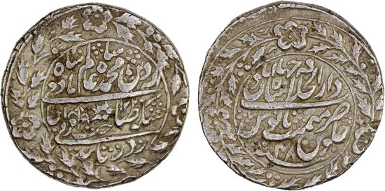 This specimen was lot 2504 in Stephen Album sale 50 (Santa Rosa, CA, September 2024), where it sold for $510. The catalog description[1] noted, "MUGHAL: Shah Alam II, 1759-1806, AR nazarana rupee, Shahjahanabad (Delhi), AH1220 year 48, border clockwise on obverse, counterclockwise on reverse, VF." This type was struck AH 1219-1221 and is quite scarce. Nazarana rupees are wider and thinner than ordinary rupees and by this type the Mughal Empire was in an advanced state of decay. Shah Alam II survived only because his neighbors, including the British, could not decide on who or what should replace him.
