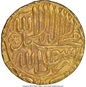 This specimen was lot 34863 in Heritage sale 3094 (Chicago, August 2021), where it sold for $22,800. The catalog description[1] noted, "India: Mughal Empire. Akbar (AH 963-1014 / AD 1556-1605) gold Mohur AH 977 (AD 1569/1570) MS63 NGC, Agra mint. With mint epithet Dar al-Khilafat. A pleasing type representative featuring nearly ideal centering and boldly engraved calligraphy. The first example of the date we have offered, and an issue usually encountered with at least minor evidence of circulation wear." The Mughal Empire stretched over most of India in the early seventeenth century and numerous mints struck silver rupees or gold mohurs for the emperor. The Mughal Empire broke up in the eighteenth century under external attack, Hindu rebellion and civil war. This collapse allowed European colonizers entry into the subcontinent and eventual British control. This type was struck in a round module (shown here) or square module, such as Fr-722c.