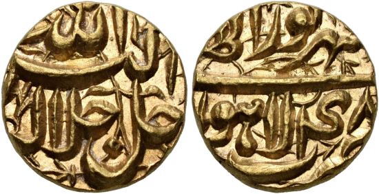 The Mughal Empire stretched over most of India in the early seventeenth century and numerous mints struck gold mohurs for the emperor. The Mughal Empire broke up in the eighteenth century under external attack, Hindu rebellion and civil war. This collapse allowed European colonizers entry into the subcontinent and eventual British control. The IE date on this specimen seems to be a regnal calendar abandoned after Akbar's death.