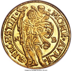 This specimen was lot 30697 in Heritage sale 3081 (New York, January 2020), where it sold for $19,200. The catalog description[1] noted, "German States: Silesia-Münsterberg-Öls. Joachim, Heinrich II, Johann, & Georg gold Ducat 1538 MS66 Prooflike NGC. A stunning gem example of this early ducat type displaying uniformly struck detailing and aurous luster that glistens across Prooflike surfaces. It is difficult to imagine locating a finer representative of this highly elusive issue. Ex. Terner Collection. From the Caranett Collection." The duchy is located in Silesia and fell to the Hapsburgs in 1647 on the extinction of the line. This ducat was issued 1537-53. Frederick the Great of Prussia seized Silesia in the 1740's but it is now part of Poland. Silver mining thalers exist in many varieties but gold mining ducats are unusual.