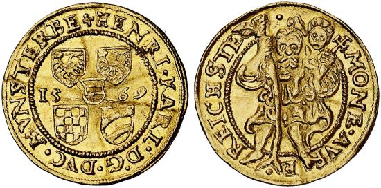 "SCHLESIEN, MÜNSTERBERG-OELS, HERZOGTUM, Heinrich III. und Karl II. 1562-1587. Dukat 1569, Reichenstein. Ausbeute der Reichensteiner Gruben. GOLD. RR Min. gewellt, vorzüglich. Exemplar der Preussag Collection, Part I. Auktion London Coin Galleries/Künker 1, London 2015, Nr. 457. (Silesia, duchy of Munsterberg-Oels, Henry III and Charles II, 1562-87, ducat of 1569, Reichenstein mint, for the mines. Rare, minor crease, extremely fine.)"