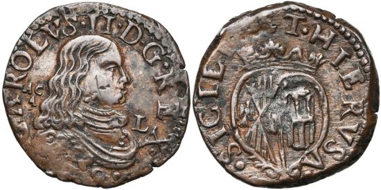 "ITALIE, NAPLES, Charles II (1665-1700), AR grano, 1679L. D/ B. cuir. à d. R/ Ecu couronné. Très Beau. (Italy, kingdom of Naples, Charles II, 1665-1700, silver grano of 1679. Obverse: armored bust right; reverse: crowned arms. Very Fine.)"