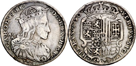 This specimen was lot 1423 in Aureo y Calicó sale 423 (Barcelona, December 2023), where it sold for 150 € (about US$194 including buyer's fees). The catalog description[1] noted, "1689. Carlos II. Naples. AG/A. 1/2 ducado. Rare. MBC-/MBC [very fine]." This was the only year this denomination was struck at this weight. It was reduced from 14 g (1684). The weight was reduced again to 10.79-11.0 g in 1693. Charles's death in 1700 ended Spanish Hapsburg rule in Italy.