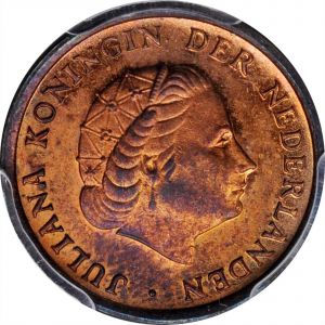 The first specimen was lot 24385 in Stack's Bowers NYINC sale (Newport Beach, CA, January 2021), where it sold for $65. The catalog description[1] noted, "NETHERLANDS. Cent, 1967. Utrecht Mint; privy mark: fish. PCGS PROOF-63 Red Brown Gold Shield. A choice overall proof issue with some mottled red-brown color." Queen Wilhelmina abdicated in 1948 in protest of Dutch colonial policy in Indonesia in favor of her daughter, Juliana, who would rule until 1980. New coin types were therefore necessary and were introduced in 1950. This bronze cent was struck without change until 1980. No dates are rare.