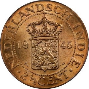 This specimen was lot 76561 in Stack's Bowers Collectors Choice sale (Costa Mesa, CA, September 2025), where it did not sell. The catalog description[1] noted, "NETHERLANDS EAST INDIES. Kingdom of the Netherlands. 2-1/2 Cents, 1945-P. Philadelphia Mint. PCGS MS-65 Red." This is a continuation of a type originally struck in Utrecht 1914-15 and 1920. The alloy is technically brass, tin being absent, but the low percentage of zinc means the coin lacks the typical yellowish tint of brass. This date was struck at Philadelphia while the Netherlands was under Nazi occupation. The Dutch found their colony of the East Indies in full scale revolt when they returned after the war. In 1949, the Dutch gave up and granted Indonesia independence.