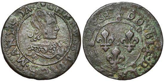 "ARCHES, Principauté, Charles II de Gonzague (1637-1659), Cu double tournois, 1638, Charleville. D/ B. à d., avec col de dentelle. R/ Trois lis dans le champ, les armes d'Alençon sur le tour. Très rare. Très Beau. Provient de la collection Tissière, 2128. (principality of Nevers and Rethel, Charles II of Gonzaga, 1637-59, copper double tournois of 1638, Charleville mint. Obverse: bust right with toothed collar; reverse: three lilies in the field, the arms of Alençon over a tower. Very rare, Very Fine.)"