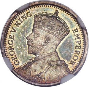 The first specimen was part of lot 31251 in Heritage sale 3037 (New York, January 2015), which sold for $14,100. The catalog description[1] noted, "George V silver 5-Piece Proof Set 1933, 3 Pence - PR65 NGC, KM1, 6 Pence - PR66 NGC, KM2, Shilling - PR66 NGC, KM3, Florin - PR66 NGC, KM4, 1/2 Crown - PR67 NGC, KM5, KM-PS1. A stunning, matched set with lightly dappled, silvery-gray patina over nicely-reflective fields. This is quite possibly a unique opportunity to own the first-issued Proof Set of New Zealand in this deluxe quality, as there are only 20 in existence." New Zealand used sterling coinage until her conversion to decimal coinage in 1967 (the same year as Great Britain and Australia). This type was struck 1933-36 and this date is common. The reverse depicts Maori war clubs.