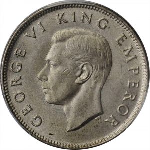 This specimen was lot 23360 in Stack's Bowers NYINC sale (New York, January 2020), where it sold for $336. The catalog description[1] noted, "NEW ZEALAND. Florin, 1944. PCGS MS-64 Gold Shield. A difficult date to encounter in such an elevated, Near Gem status, this superlative piece offers steel gray surfaces enchanted through blistering brilliance. The sole finest certified in the PCGS census. From the Fenton Collection." This florin struck for George VI retained the kiwi reverse introduced with George V. This type was struck 1937-46 tho none were made 1938-39. In 1948, the obverse was revised from "GEORGE VI KING EMPEROR" to "KING GEORGE THE SIXTH." The denomination was terminated upon decimalization in 1965.