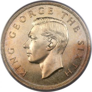 The first specimen was lot 31254 in Heritage sale 3037 (New York, January 2015), where it sold for $21,150. The catalog description[1] noted, "George VI Proof Crown 1949 PR66 PCGS. This broad and magnificent offering features the bare head of George VI and a silver fern leaf flanked by stars. The only Crown issued by New Zealand to bear the portrait of this King, with fully-mirrored surfaces awash in a sublime mixture of peach and gold patina. The reported mintage of this piece is estimated around three; whether or not that number is accurate seems to matter very little since in the past ten years, this coin has only been publicly offered four times. A highly interesting specimen with an equally intriguing back story: Struck for the King's proposed visit to New Zealand in 1949, his trip to the South Pacific was actually canceled because he fell ill from numerous ailments. Not surprisingly, the single finest graded example of this elusive issue graded by either PCGS or NGC." The circulation strikes are common in all grades tho the proofs are rare.