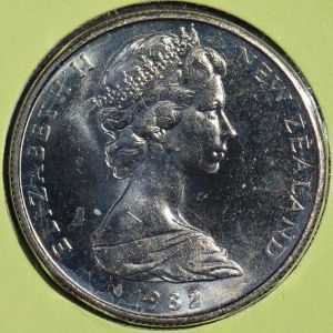 In 1967, New Zealand abandoned the sterling coinage she had used since the days of Captain Cook and adopted the decimal dollar and cent. This fifty cent piece was struck 1967-85 at London, Canberra and Ottawa, New Zealand lacking her own mint. It was made in large quantities and was superseded by the Maklouf bust of the queen (KM 63, struck 1986-98).