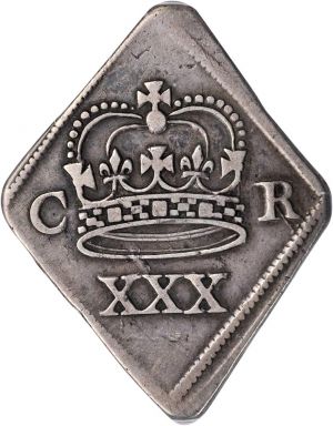 This specimen was lot 20275 in Stack's Bowers NYINC sale (Newport Beach, CA, January 2021), where it sold for $3,120. The catalog description[1] noted, "GREAT BRITAIN. Newark (Besieged). 1/2 Crown, 1645. Charles I. ANACS VF-30. A popular siege issue, the 1645 date is assuredly SCARCER than its 1646 counterpart. Lightly toned and pleasant, this example has seen some even, moderate wear, yet remains quite wholesome and with a flan that features far fewer flaws than can typically be encountered for these obsidional issues." The besieged royalists also issued silver sixpence, ninepence and shillings. Altho these appear fairly regularly in auctions, high demand brings high prices.