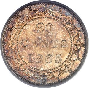 This specimen was lot 24258 in Heritage sale 3032 (Chicago, April 2014), where it sold for $9,400. The catalog description[1] noted, "Newfoundland. Victoria Specimen 20 Cents 1865, London mint, SP64 PCGS. Plain Edge - Medal Alignment. A coin with commanding eye-appeal, bathed in amber-gold patina that transitions to red, blue and purple hues at the edges. Watery reflectivity remains in the fields which produces a sparkling effect when turned against a light. Light handling confirms the grade, but hardly diminishes the appearance. The type, once cataloged as "Possibly Unique" in the famous Norweb sale has since proven not to be, however the number of examples extant certainly remain below 10. Of those, the present piece must be among the most appealing - a real treasure! From The Prager Collection of Canadian Specimen Coins." This type was struck 1865-1901 and many of the later dates are common. The specimen strikings of 1865 come in plain and reeded edges.