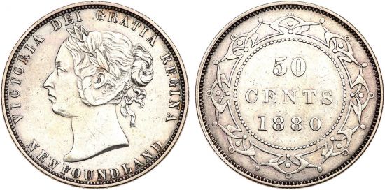 This specimen was lot 2097 in Goldberg sale 93 (Los Angeles, September 2016), where it sold for $360. The catalog description[1] noted, "Newfoundland. 50 Cents, 1880 NGC EF. Victoria. NGC graded Extremely Fine, Details (Surface Hairlines). Estimated Value $150 - 200. From the Aurora Family Collection." This type was struck at Heaton and London 1870-1901 for Newfoundland and is slightly heavier than the contemporary Canadian fifty cents. Struck in small numbers and exposed to long circulation, it is very rare in nice condition. Proofs exist.