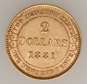 This specimen was lot 22370 in Heritage sale 3010 (Boston, August 2010), where it sold for $402.50. The catalog description[1] noted, "Newfoundland. Victoria gold 2 Dollars 1881, sharp XF, good portrait for the grade." This type was struck for Newfoundland in limited numbers 1865-88 and is fairly available in circulated condition. This date is priced about 50% more than the common date (1888) in high grade.