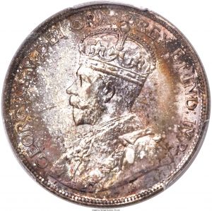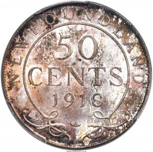 This specimen was lot 30587 in Heritage sale 3049 (Long Beach, September 2016), where it sold for $1,997.50. The catalog description[1] noted, "Newfoundland. George V 50 Cents 1918-C MS65+ PCGS, Ottawa mint. A short-lived series and scarce as such, this present offering features heavy mottling that covers both sides. The surfaces retain much of their argent tone within the centers and are striated by shades of lavender, champagne, and graphite color. As such, PCGS has awarded this selection with the sought-after plus designation, and at present time, this coin is bested by only one other certified example." This type was struck in Ottawa for Newfoundland in limited numbers 1911 and 1917-19 and is fairly available in grades up to extremely fine. This date is common.