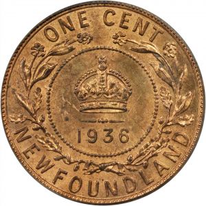 This specimen was lot 42164 in Stack's Bowers Winter sale (Baltimore, November 2015), where it sold for $152.75. The catalog description[1] noted, "CANADA. Newfoundland. Cent, 1936. PCGS MS-65 RD. Last year for the portrait and type, and with the coveted RED designation. Quite solid for the grade and housed in an older PCGS green tag slab." Six dates exist of this type struck 1913-36. It is the last large cent struck in North America, Canada having dropped large cents in 1920 and the United States in 1857. The 1936 is the most common date tho not the highest mintage.
