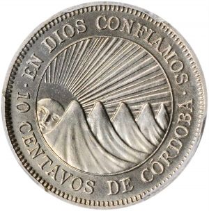 This specimen was lot 41245 in Stack's Bowers ANA sale (Costa Mesa, CA, August 2021), where it sold for $1,920. The catalog description[1] noted, "NICARAGUA. 10 Centavos, 1952. PCGS PROOF-66 Gold Shield. A VERY RARE proof-of-record striking, this coin represents one of only two examples certified by PCGS and NGC combined, and is the first to have surfaced at public auction. True to its assigned grade, limited handling is apparent, with a soft golden tone visible on both sides. An ideal coin for the collector specializing in hard to find Central American issues." This type was struck 1939, 1946 and 1950-56 while the Somozas were in power. The weight was reduced to 3.91 g in 1961. In 1967, the brutal and corrupt Luis Somoza died of a heart attack and was succeeded by his brutal, corrupt and incompetent brother, Anastasio, with baleful consequences for Nicaragua.