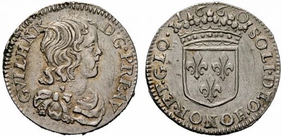 "FRANKREICH, Orange, Fürstentum, Guillaume-Henri, 1650-1702. Luigino (5 Sols) 1660. Jugendliches, geharnischtes Brustbild nach rechts. Rv. Gekröntes Wappen. Kl. Kr. Fast vorzüglich-vorzüglich" (France, Pricipality of Orange, William Henry, 1650-1702, luigino (5 sols) of 1660. Young draped bust to right. Reverse: crowned arms. Tiny scratches, Extremely Fine to nice Extremely Fine)