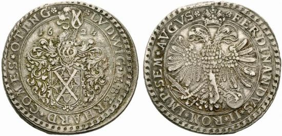 "DEUTSCHLAND, Öttingen, Grafschaft, Ludwig Eberhard, 1622-1634. Taler 1624. Titel Ferdinand II. Behelmtes Wappen, zu den Seiten der Helmzier die Jahreszahl. Rv. Gekrönter, nimbierter Doppeladler. Kl. Zainende. Sehr schön-vorzüglich." (County of Öttingen, Louis Eberhard, 1622-34, thaler of 1624, issued in the name of emperor Ferdinand II. Obverse: helmeted arms, dog's head crest divides date; reverse: crowned, haloed double-headed eagle. Very Fine to Extremely Fine.)
