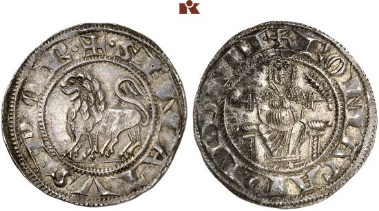"RÖMISCHER SENAT, 1184-1439. Grosso anonimo o. J. (1257-1270), Rom. + • SEN[retrograd]ATVS • P • Q • R • Löwe schreitet l., den Kopf nach vorn gewandt//+ • ROMA CAP’ • MUN[retrograd]DI • Roma thront v. v. mit Globus und Palmzweig. Selten in dieser Erhaltung. Schöne Patina, vorzüglich. Exemplar der Spezialsammlung Münzen und Medaillen der Päpste, Auktion Fritz Rudolf Künker 233, Osnabrück 2013, Nr. 1101. (Papal States, senatorial issue, 1184-1439, undated anonymous grosso, circa 1257-70, Rome mint. Obverse: lion rampant left; reverse: Roma enthroned facing, with orb and palm branch. Scarce in this quality, handsome toning, extremely fine.)"