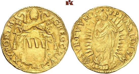 "ITALIEN, KIRCHENSTAAT/VATIKAN, Gregor XV. 1621-1623. Quadrupla o. J. Rom. Wappen, darüber gekreuzte Schlüssel und Tiara//Die betende Jungfrau Maria mit Sternenkranz steht v. v. auf Mondsichel und Wolken, umher Strahlenkranz. GOLD. Von großer Seltenheit. Bearbeitungsspuren, fast sehr schön. (Italy, Papal State, Gregory XV, 1621-23, undated quadrupla d'oro, Rome mint. Obverse: arms under the papal tiara; reverse: the Virgin Mary seated on the crescent moon in a glory. Very rare, tooled, about very fine.)"