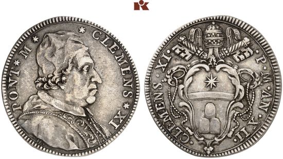"PAPST CLEMENS XI., 1700-1721. Die Münzstätte Rom. Giulio AN XII (1711/1712), Rom. Stempelschneider Ermenegildo Hamerani. R Fast vorzüglich. (Papal States, Clement XI, 1700-21, giulio of year XII, Rome mint, engraver Ermenegildo Hamerani. Rare, about extremely fine.)"