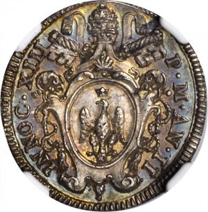 This specimen was lot 21260 in Stack's Bowers ANA sale (Philadelphia, August 2018), where it did not sell. The catalog description[1] noted, "ITALY. Papal States. Vatican City. Giulio, ND (1722). Innocent XIII. NGC MS-64. Carefully preserved and exceptionally toned with splashes of blue, green mauve and gold tone over glinting surfaces. A superb presentation! Once appearing in an Astarte S.A. auction in May 2006 where it brought 1,600 CHF hammer (approximately $1,300 at the time). Ex: NAC 14, October 1998, lot 1181." This specimen was lot 21258 in Stack's Bowers ANA sale (Chicago, August 2019), where it still did not sell. The giulio was ten baiocchi, while the piastra, the Italian equivalent of the German thaler, was 105 baiocchi (3½ testone).