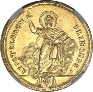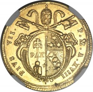 The first specimen was lot 25185 in Heritage sale 3026 (Long Beach, October 2013), where it sold for $1,880. The catalog description[1] noted, "Papal States. Pius VII gold Doppia 1817-R Anno XVIII, MS63 NGC, well-struck with full mint luster, tiny natural flan flaw near the rim." A doppia was originally a double scudo but by this period was substantially lighter. The SCWC lists this type for 1815, 1817 and 1823. The last doppia was struck in 1834.
