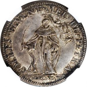 This specimen was lot 35022 in Ponterio sale 177 (Chicago, August 2013), where it sold for $793. The catalog description[1] noted, "ITALY. Papal States. Giulio, MDCLXX (1670)-I. NGC AU-58. Clement X (1670-76). From the Demarete Collection." Coinage of the Papal States remains popular today for, besides the strong associations for Catholics, this period saw a string of commemorative issues featuring wonderfully vivid portraits of the various men who occupied the throne of St. Peter. This type was issued 1670 only. A giulio was one third of a testone and one tenth a piastra.