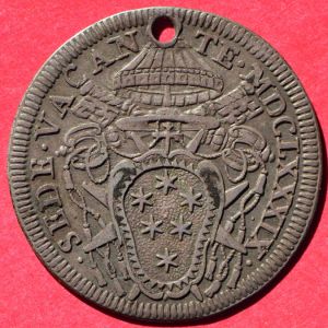 This type was minted in 1689 as a sede vacante issue after the death of Innocent XI. The SCWC lists two different giulii for 1689, one sede vacante (shown here) and one for Innocent XI. The testone was thirty baiocchi, while the piastra, the Italian equivalent of the German thaler, was 105 baiocchi (3½ testone).